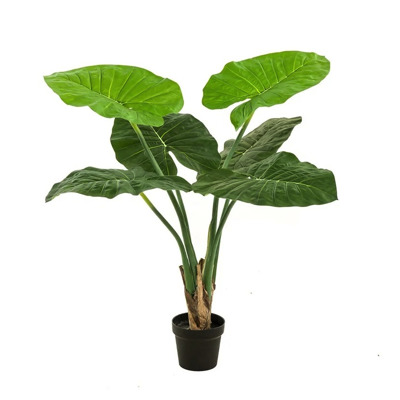120 cm - Copac artificial Alocasia frydek (Urechea Elefantului) pe trunchi natural in ghiveci negru din plastic, 9 frunze artificiale. Element decorativ potrivit pentru terase, balcoane si alei.